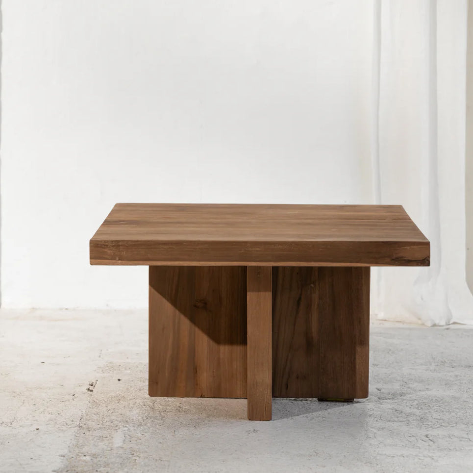 Modern Form Meets Natural Beauty With its bold square silhouette and raw, organic aesthetic, this modern coffee table is a striking blend of form and function. Each piece is handcrafted from sustainably sourced recycled teak, highlighting the natural grain, texture, and rich tonal variation of the timber.