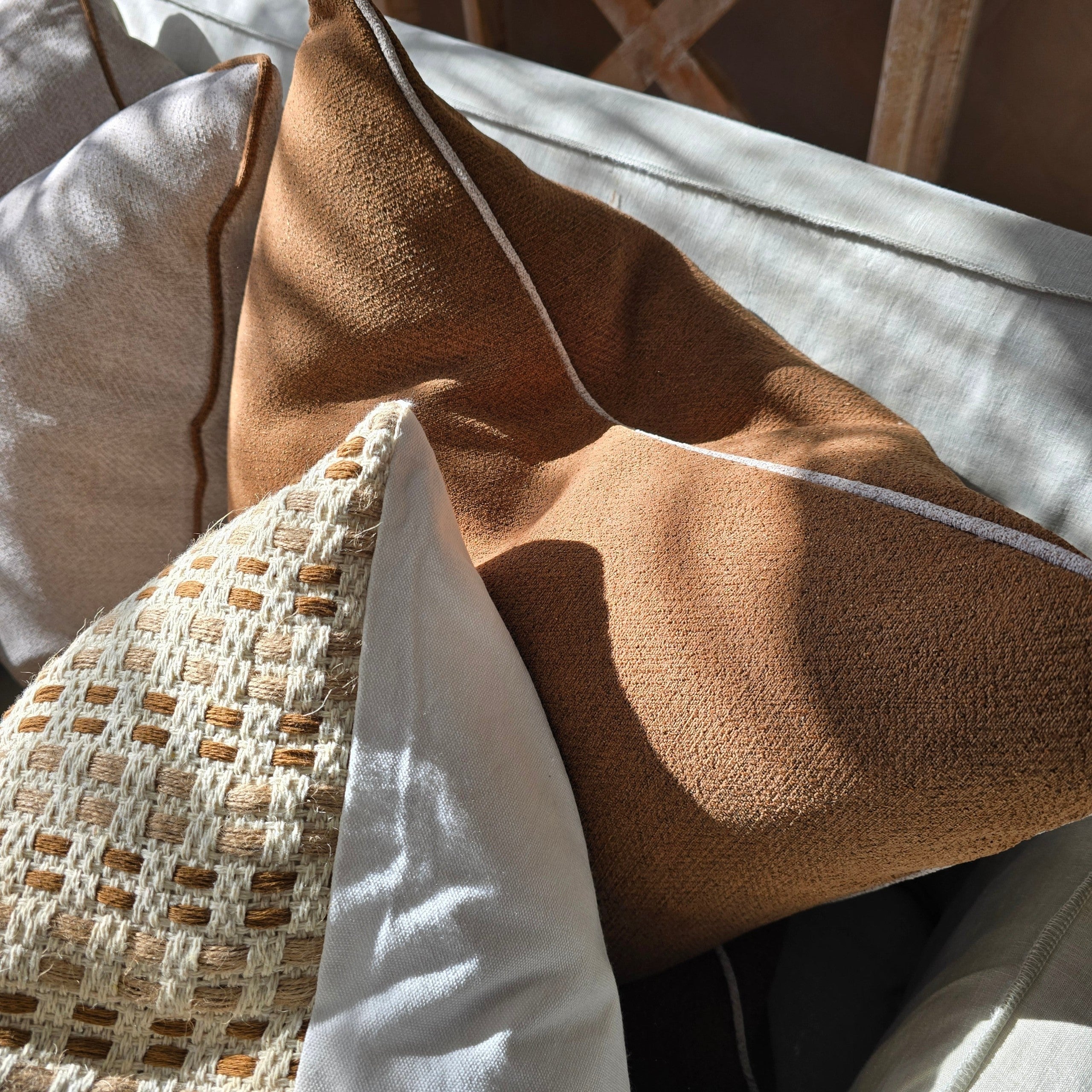 Enhance your space with the elegant and durable Hailey Linen Chenille Cushion. Crafted with long-lasting chenille fabric, this Hailey cushion collection boasts a beautiful vibrant color with delicate piping edge. Bring a touch of sophistication and style to your home. Dimensions (cm): 55W x 55H Material: Linen/Chenille, Comes with feather insert Colour: Terracotta with Natural Piping Care instructions: Gentle machine wash Do not bleach Do not dry clean Do not iron Line dry in shade or tumble dry on low