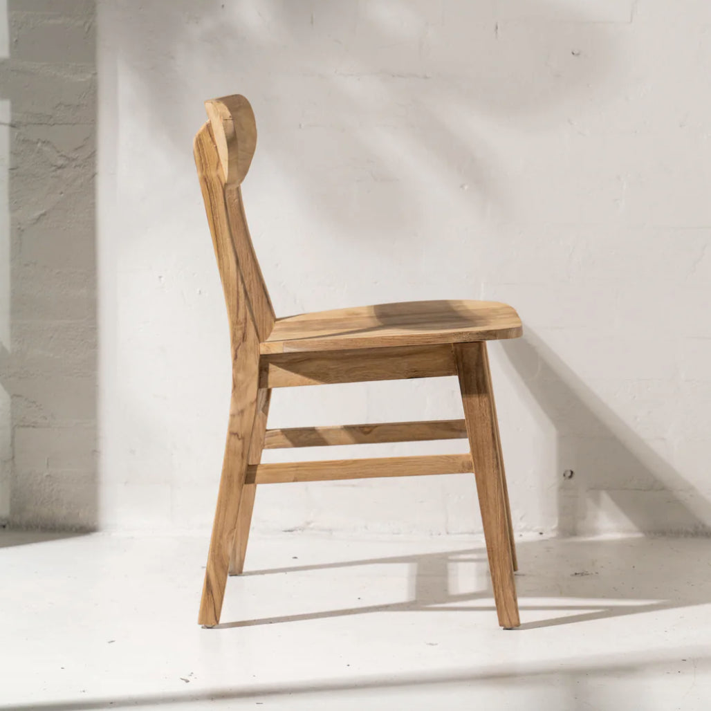 This handcrafted dining chair brings a raw, organic elegance to any space. Made from recycled teak, it celebrates the beauty of natural materials—showcasing the wood’s unique grain, texture, and tone.