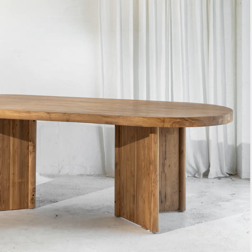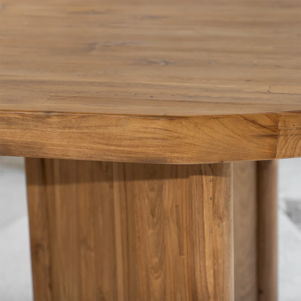 With its gently curved, oval silhouette and refined smooth finish, this handcrafted table is a modern interpretation of timeless design. Made from sustainably sourced recycled teak, each piece highlights the natural grain, tone, and texture of the wood—delivering understated luxury with a warm, organic feel.
