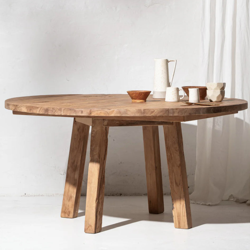Celebrate the raw beauty of natural materials with this striking table, crafted by hand from recycled teak. Designed to highlight the wood’s unique grain, knots, and texture, each piece tells its own story—no two are ever the same. The reclaimed timber features natural imperfections, patches, and subtle variations that give it genuine rustic character and timeless appeal.