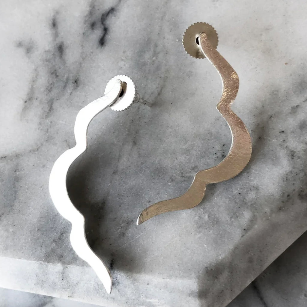Featuring bold, sculptural forms, each pair is meticulously crafted in brass and finished with radiant sterling silver plating, embodying timeless elegance and refined artistry.