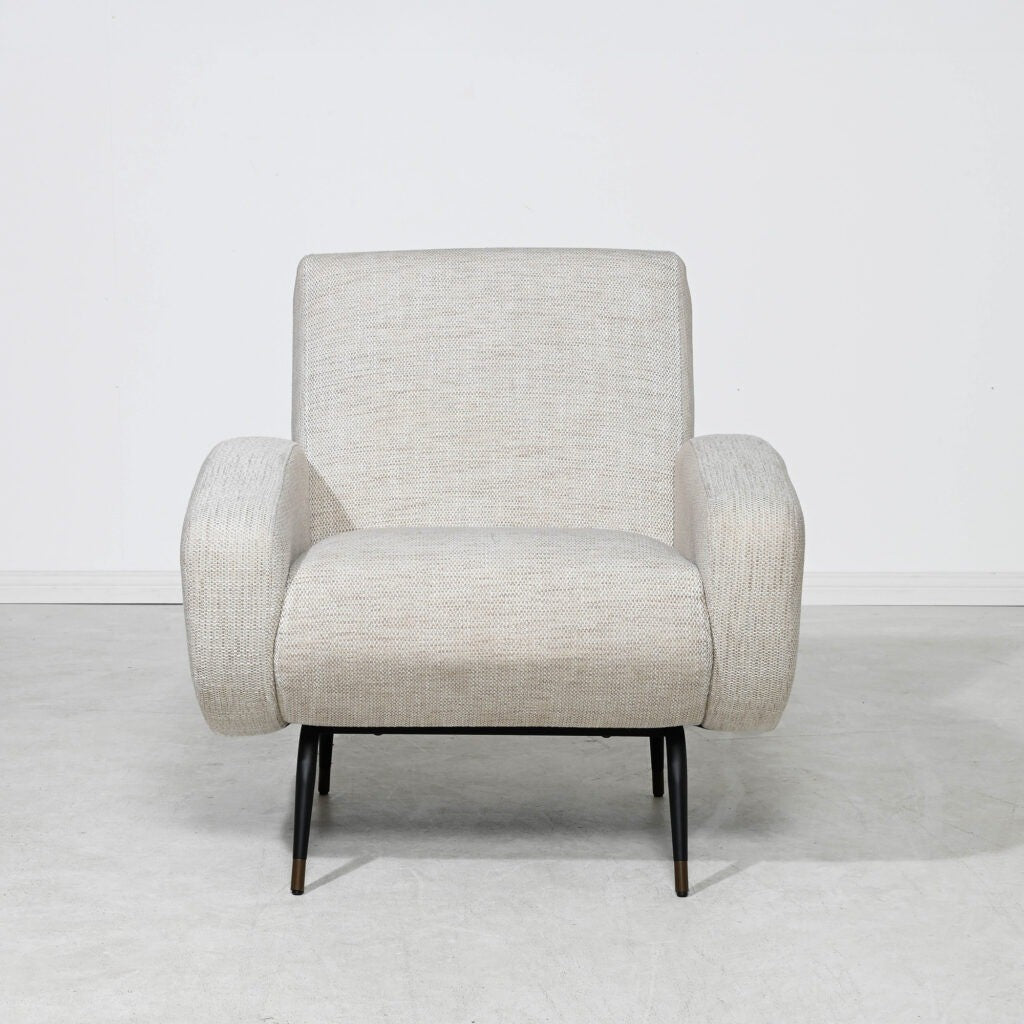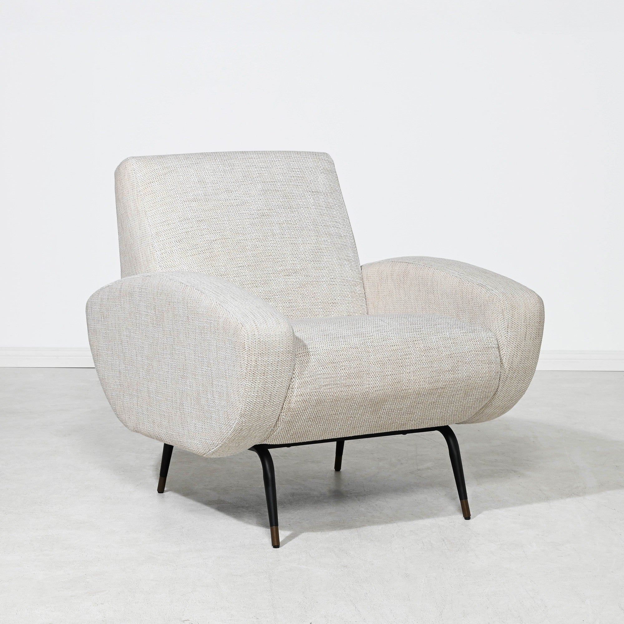 Transform your interior with the Kennedy’s contemporary lines. The perfect seating angle is supported by matt black metal legs with a subtle brass cup. Look no further than this natural beige armchair design to compliment your space.