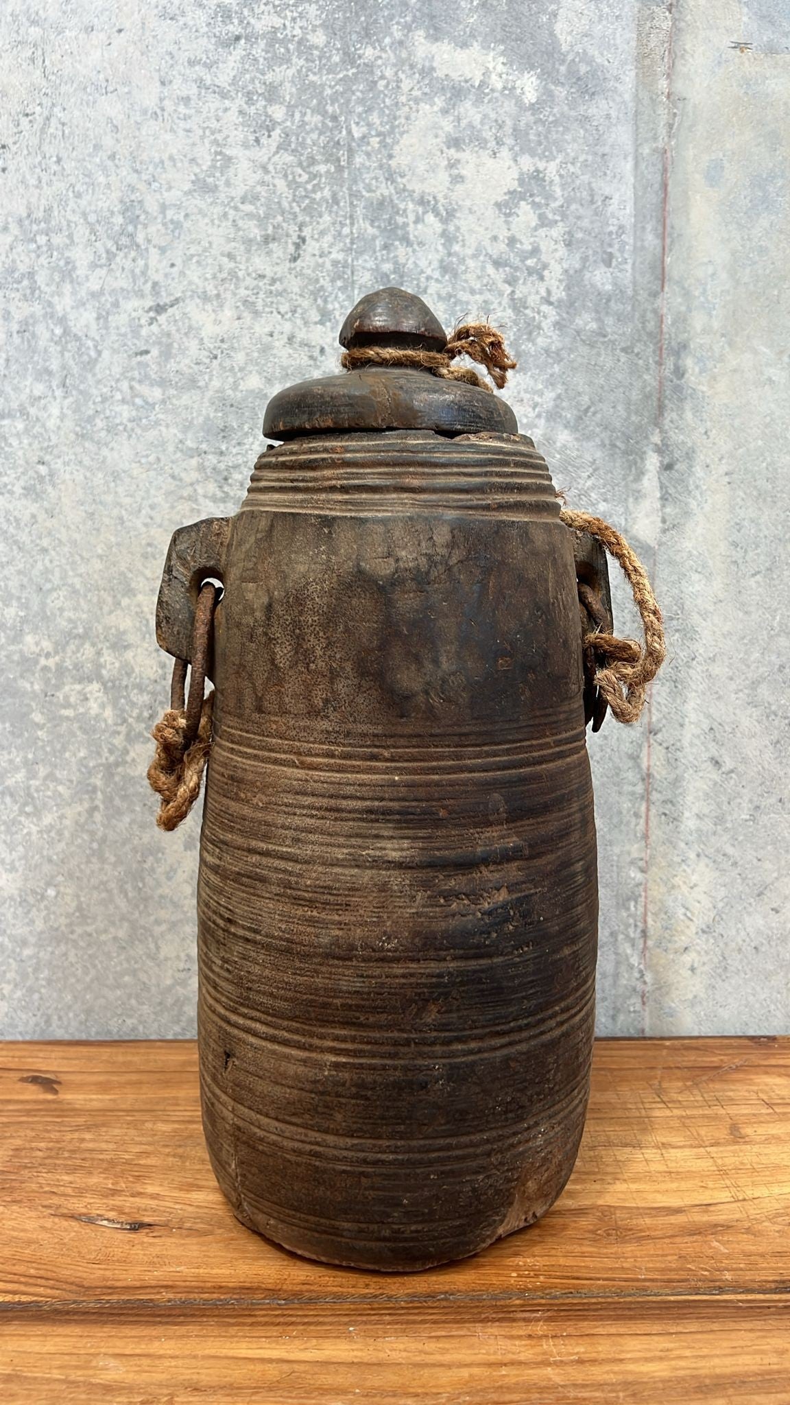 Rich in history and natural character, this Antique Nepalese Wooden Lidded Pot is a beautifully aged piece that brings warmth and authenticity to any space. Handcrafted from timber and finished with a timeworn patina, each pot features subtle imperfections that reflect its heritage and unique story. Style it on a console, sideboard or open shelving as a sculptural accent, or layer it with other vintage vessels for a collected, worldly look. Due to its antique nature, variations in tone, texture and wear are to be expected and celebrated.