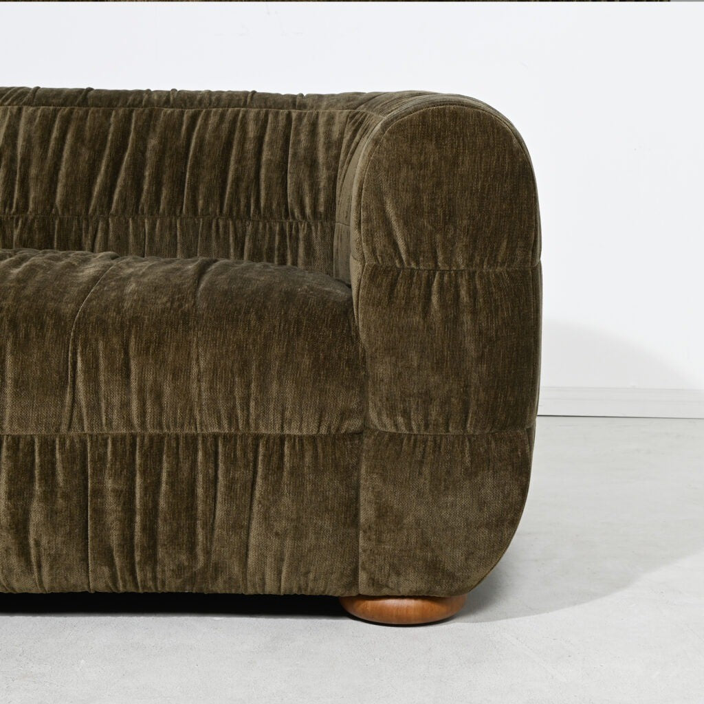 Upholstered in a rich olive velour, the fabric subtly catches and reflects light, lending the piece a soft glow that shifts with the space around it. Its earthy tone makes it highly versatile, pairing beautifully with both natural palettes and more structured, tonal interiors.