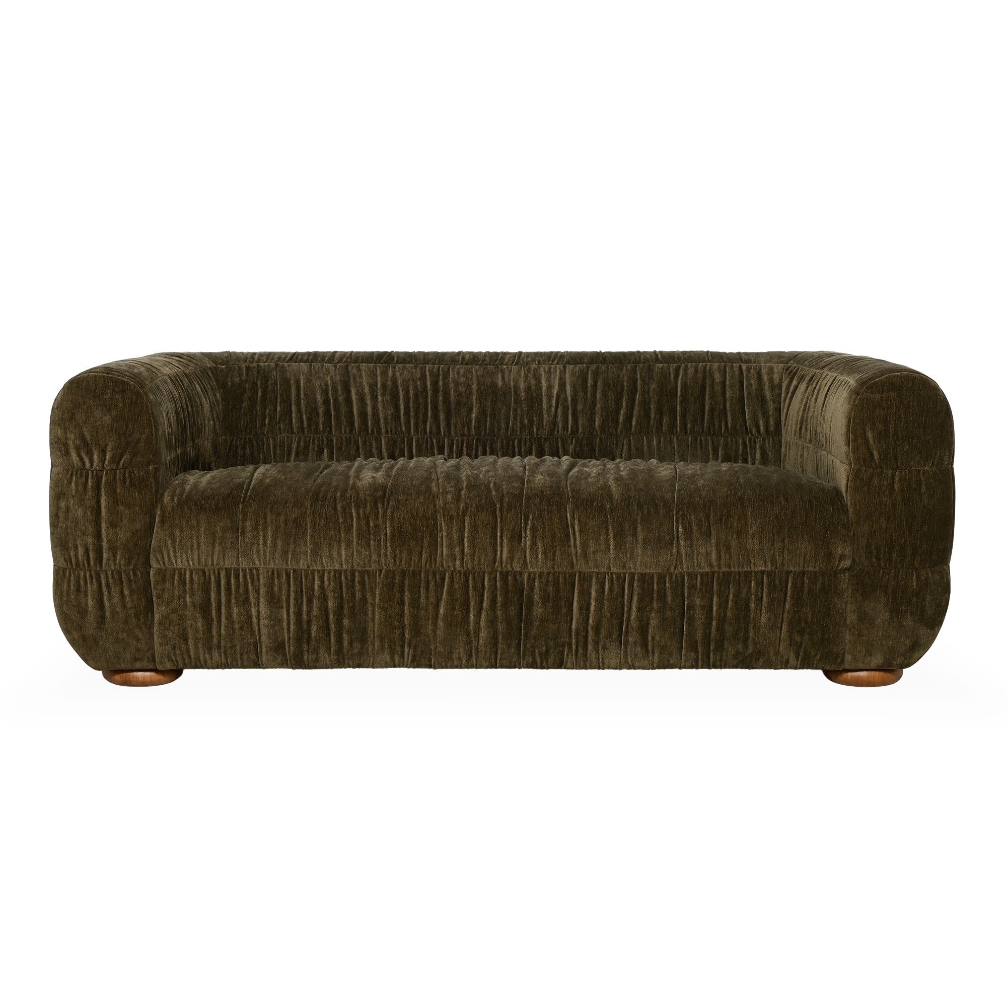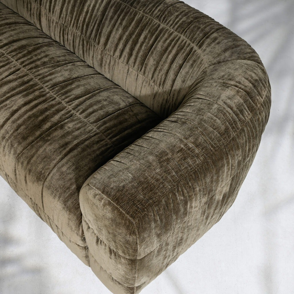 The Revvy Sofa is a sculptural, statement-making three-seater designed to offer luxurious comfort wrapped in contemporary flair. Defined by its gathered ruffle detailing and horizontal stitch lines running rhythmically across the form, the Revvy delivers texture, tone, and trend in equal measure.